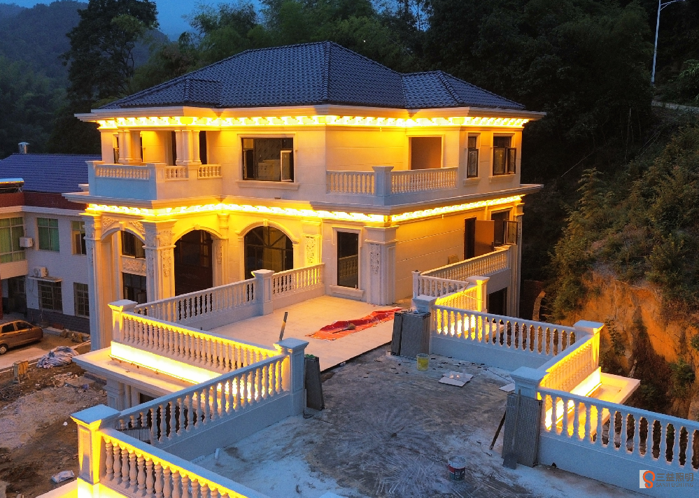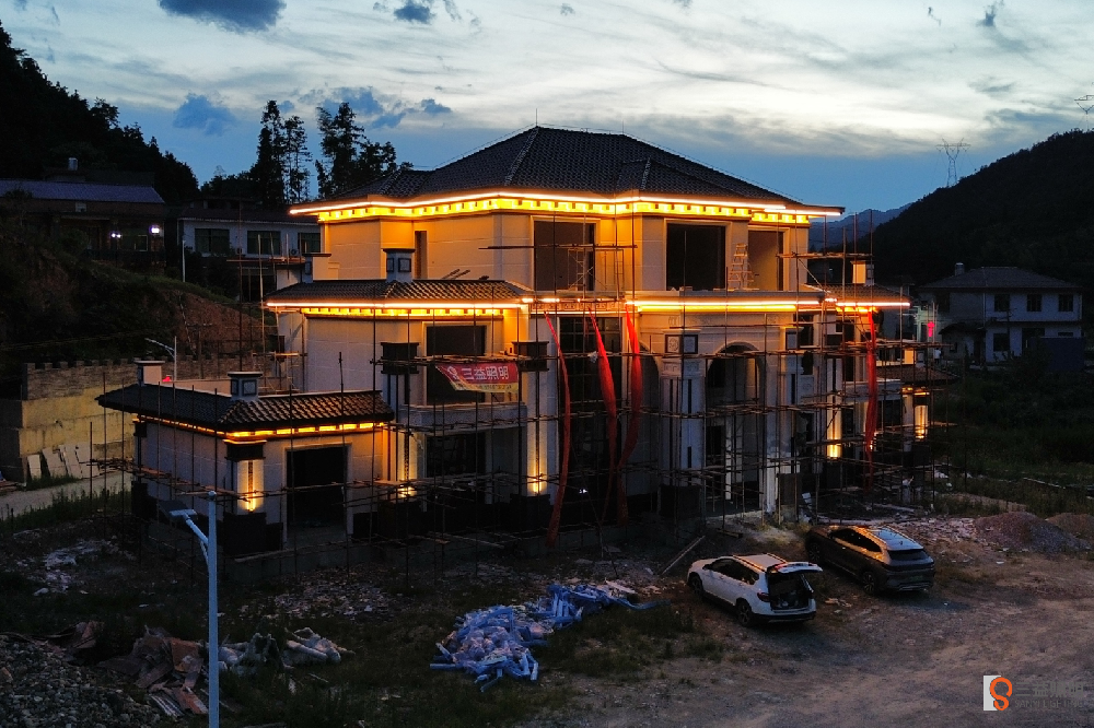 大福劉府是三層新中式別墅,外墻使用藝術(shù)仿石漆,搭配暖白色燈光,效果溫馨又豪氣。