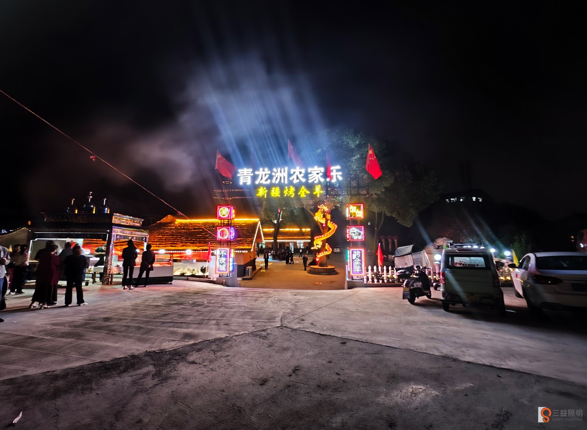 青龍洲農家樂,經營農家菜,新疆燒烤,烤全羊等,經過線條燈,洗墻燈,瓦燈,發(fā)光字,網紅門樓等,營造出益陽一處新的網紅打卡地。